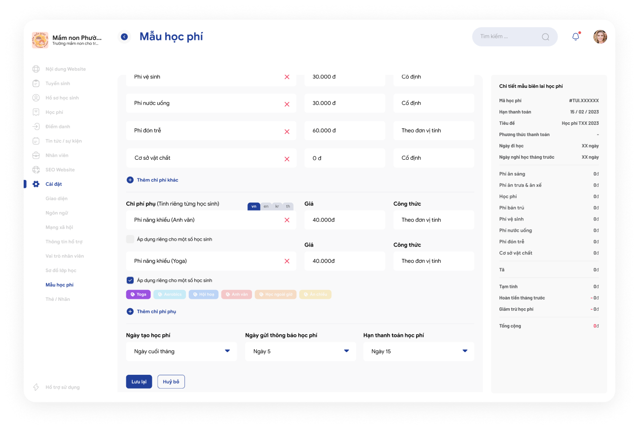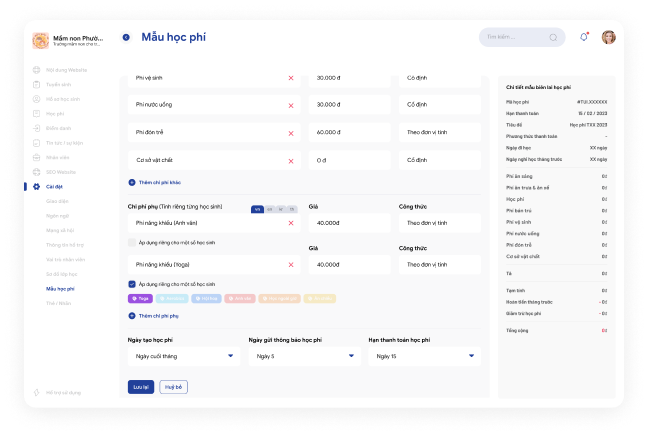 Tạo lập một lần và để hệ thống lo liệu với mẫu hóa đơn học phí tự động. Dù trường bạn cần tính toán linh hoạt thế nào, hệ thống của Mầm Chồi Lá cũng đảm bảo mọi hóa đơn đều chính xác, rõ ràng và đúng hạn!